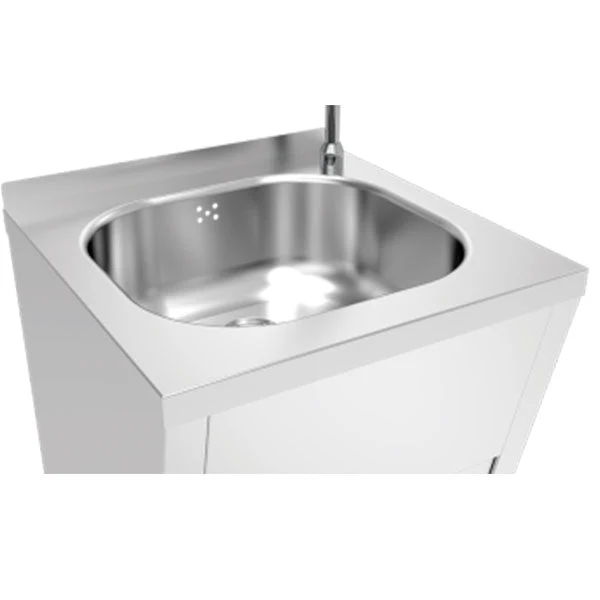 Lava mãos construído em aço inoxidável com acabamento fosco Scoth-brite, possui uma válvula misturadora na qual a temperatura de serviço é regulada.