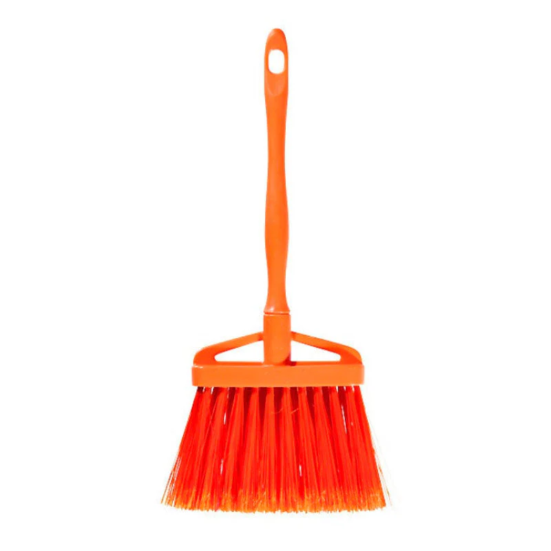 Vassourinha espalmada para lixo com comprimento de cabo de 20 cm e de escova de 10 cm.